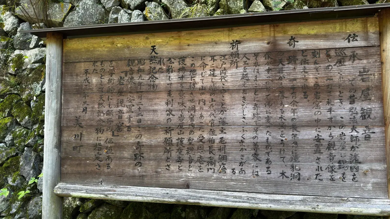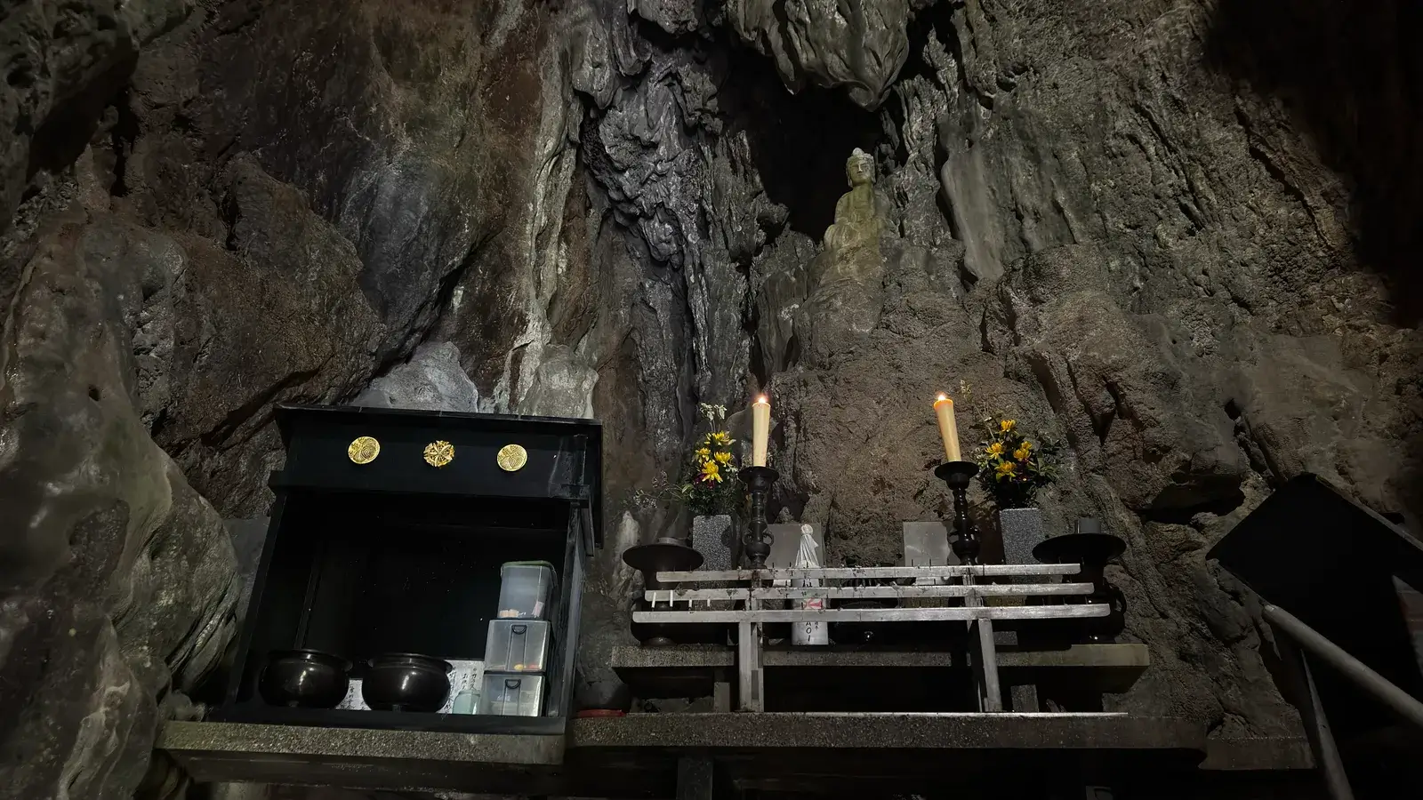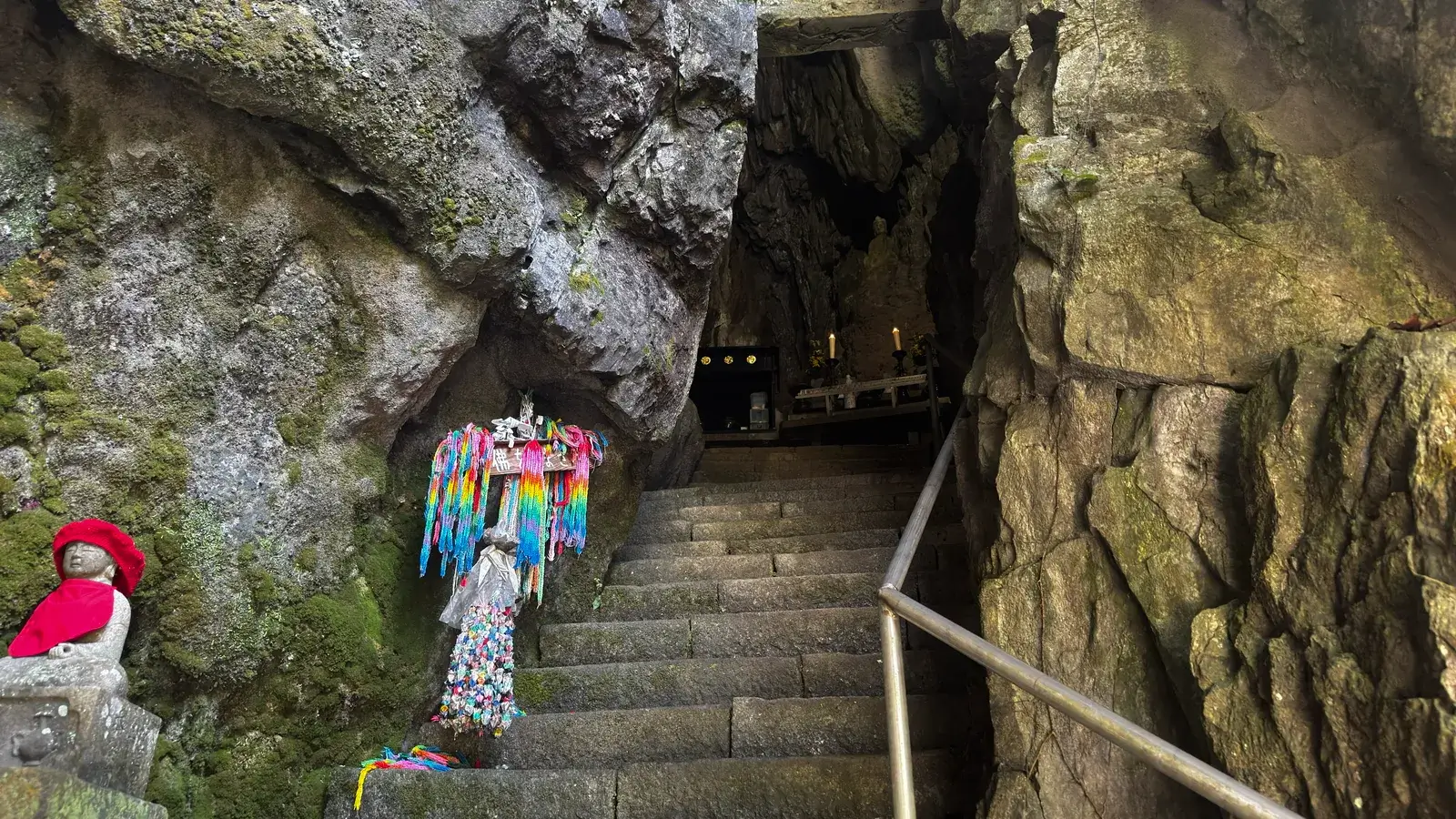 岩屋観音は、かの弘法大師がこの地へ来た時木彫りの観音様を安置したところ、鍾乳石の雫が長い年月をかけて木製の仏像を石仏に変えて今に至るという事。なんとも歴史ロマンな話です。