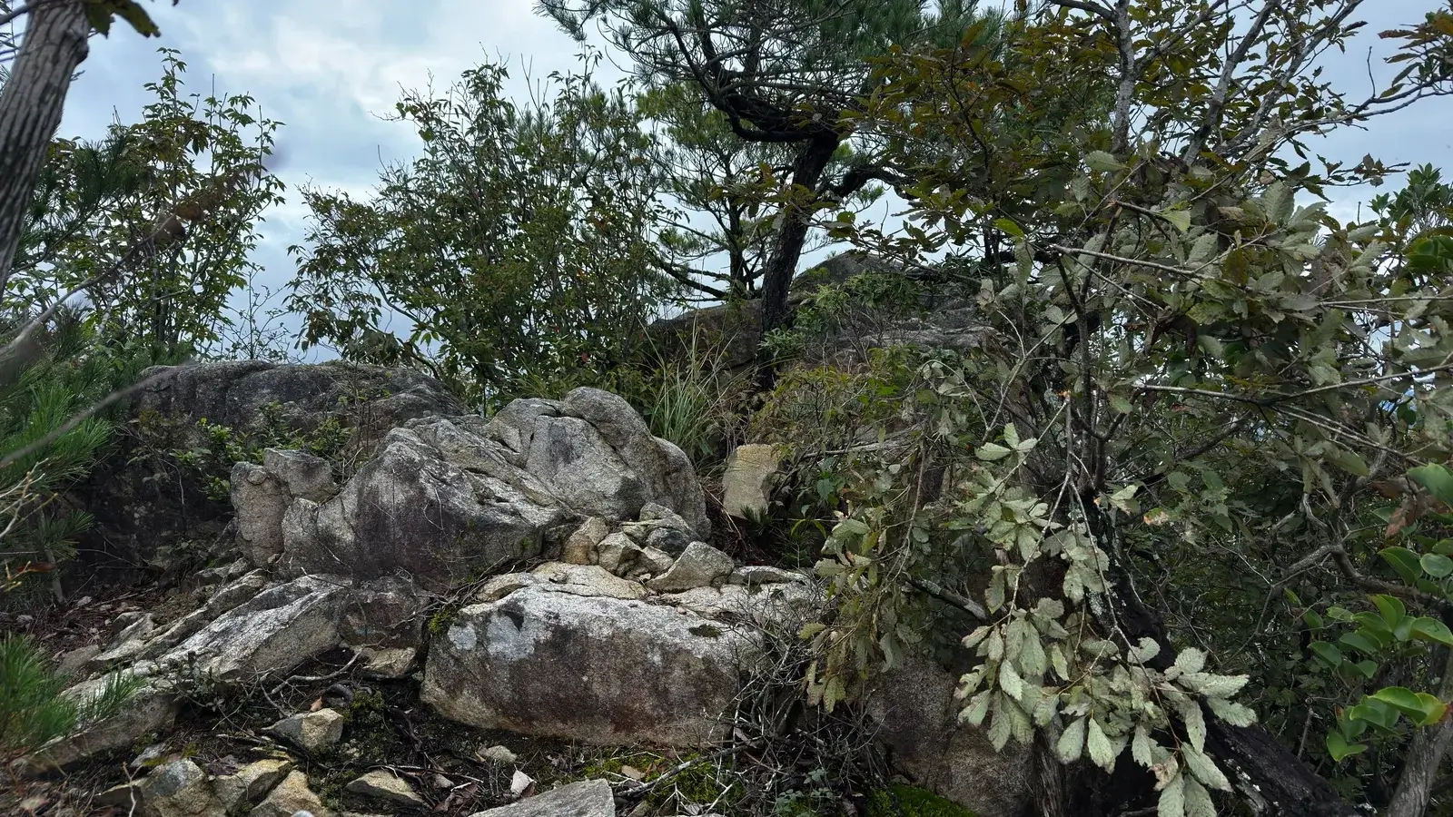 引き返して山頂を目指す。丁度分岐まで戻った所で4人組のグループさんと出会った。その中のリーダーとおぼしき方の話では、かつて岩場の近くに電波塔があり、その為に整備された道なのだとか。それにしても珍しい。中電の巡視路等は獣道同様なのだが。