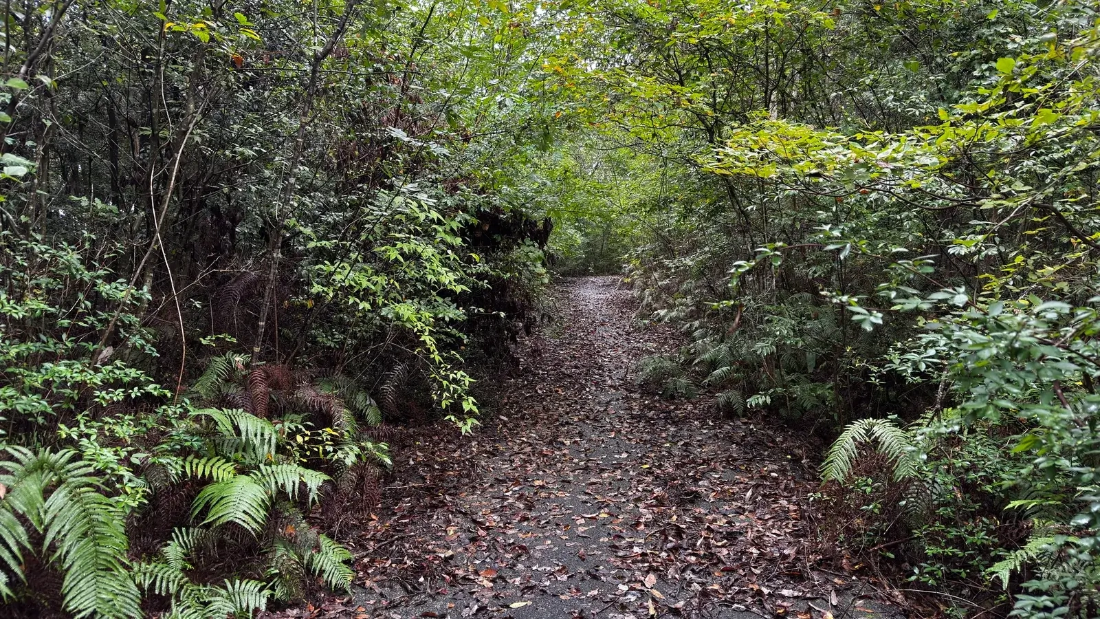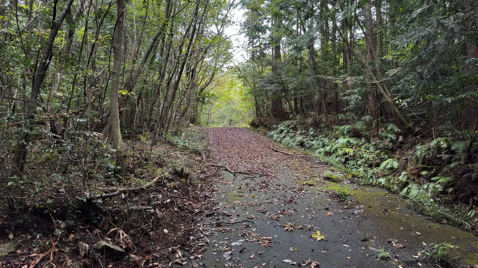 薄暗い林道を歩く。何故か林道を過ぎても道がずっと舗装されている。車は通れる幅では無いのに。防護柵や石階段もある。神社でもあるのか?稜線の分岐に出る。ここから西側が山頂だが、階段が続く東側の道を歩いてみる。